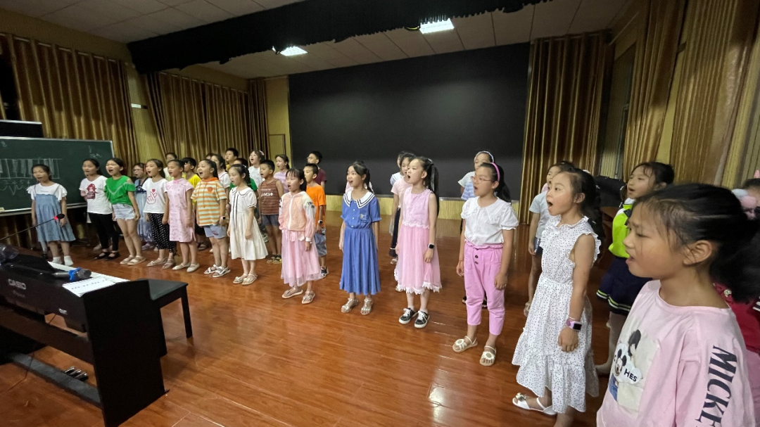 伴着窗外的蝉鸣声,第一天的训练开始了,问题也随之而来。孩子们唱的是《红星歌》和英山童谣《黄鸡公》。《红星歌》这首作品合唱版本很多,歌谱和钢伴谱的匹配尤其要注意,到了现场我发现孩子们唱的版本和之前我拿到的版本不一样;《黄鸡公》是根据当地流传的童谣重新编创的二声部歌曲,在音域上其实有一点不太适合四年级的孩子们;由于这只队伍组建时间不长,孩子们虽然配合度很高,但歌唱状态、歌唱意识、音准都有待加强,对于旋律音程和和声音程的构建也近乎空白。根据作品和孩子们的状态,我们临时调整了训练计划,以示范教学,便于音乐老师们如何开展日常训练为主。