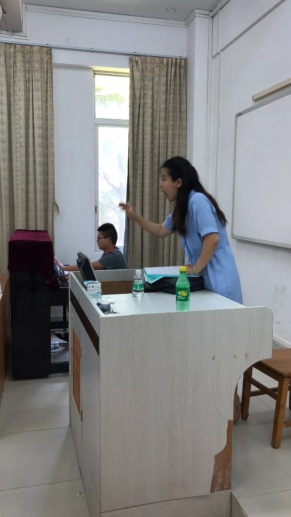 郭老师还为我们带了中央音乐学院的研究生胡迪老师为大家助力。三天的时间,准备两首合唱作品:《带我到山顶》、《清流》,在郭老师的指导下,团员的乐感、音准、节奏、情感表达等能力得到迅速的提升。
