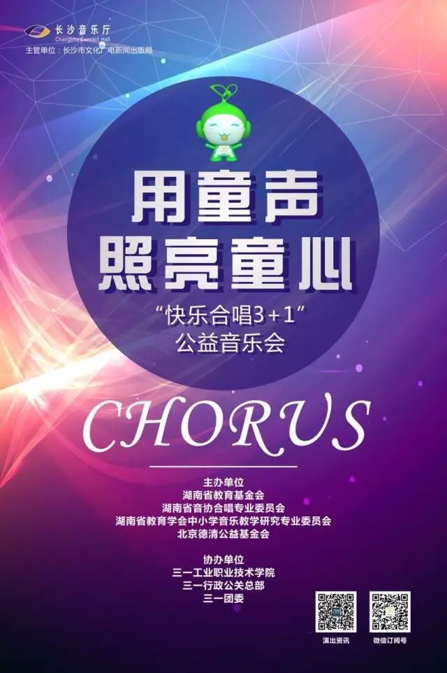 本次音乐会为第三届”快乐合唱3+1”公益音乐会,由湖南省教育基金会、湖南省音协合唱专业委员会、湖南省教育学会中小学音乐教学研究委员会和北京德清公益基金会主办,演出人员多为乡村非专业合唱队员,但获得了各界人士的大力支持,各项目县在长沙领导及嘉宾44位莅临音乐会现场(嘉宾名单附后)。