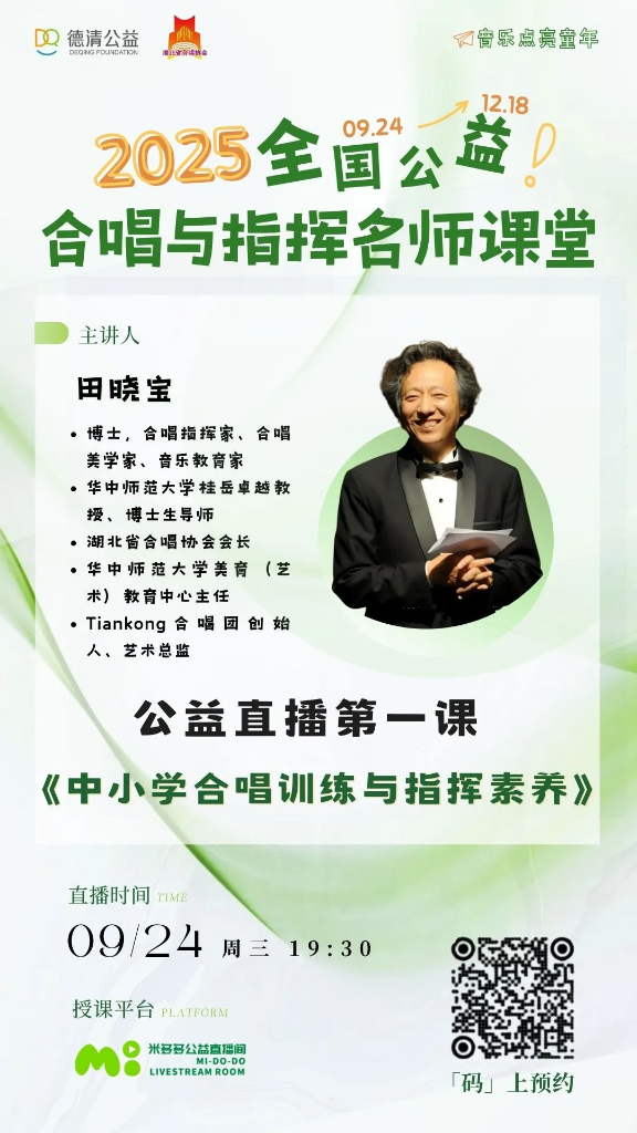 由北京德清公益基金会与湖北省合唱协会联合主办的音乐点亮童年·2025全国公益合唱与指挥名师课堂直播活动将于9月24日(本周三)晚七点半正式启动!