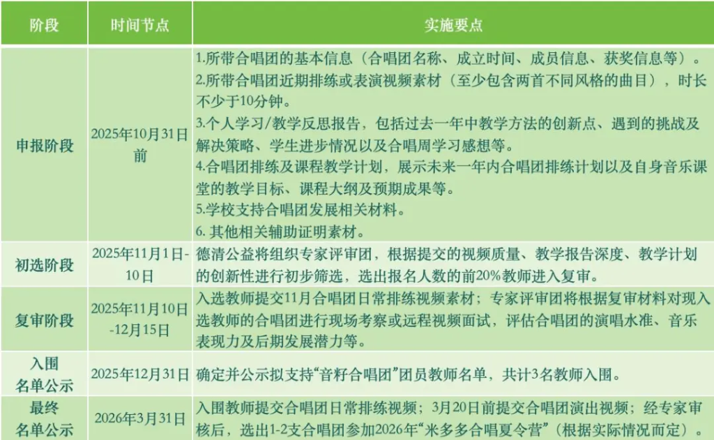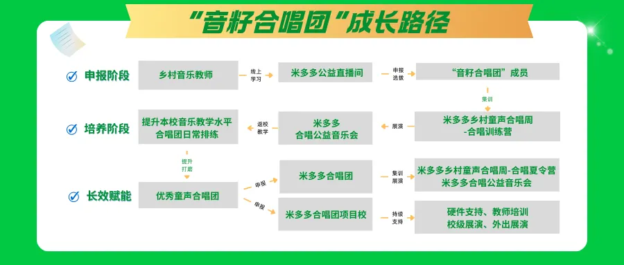 未入选2026年米多多合唱夏令营的备选团队,可继续参加2026年同类活动,同等条件下优先考虑。德清公益后期还会为致力于校园合唱艺术普及与推广的“音籽合唱团”提供帮扶,如共建“米多多合唱团“项目校等合作机会。详细可看下方成长路径图��: