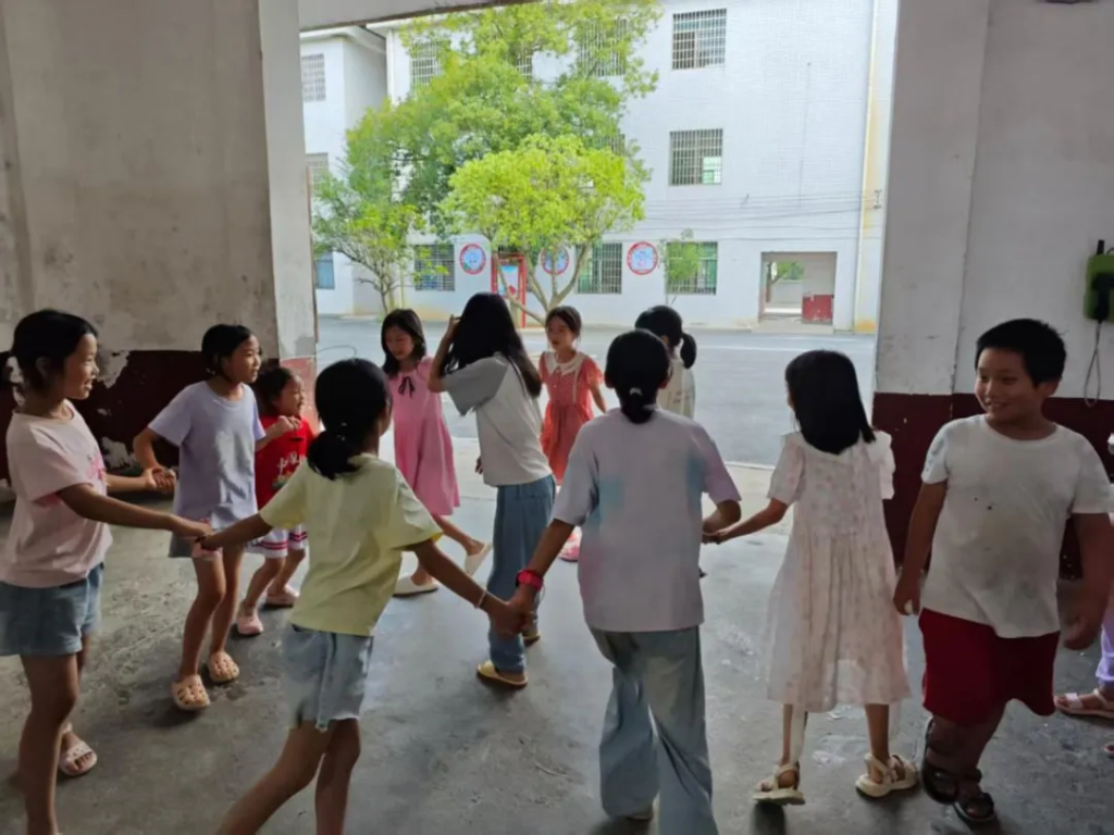 7月3日,团队里负责本次活动宣传摄影的陈彦文来到了华王中小,孩子们看到他手中的相机并没有躲着,反而是自信、开朗地朝着镜头打招呼。课间的时候,孩子们纷纷围在陈老师身旁,手牵着手转着圈,脸上肆意绽放出温暖的笑容,像是清晨暖融融的阳光照在这片土地上,也照在了我的心上。陈老师手中的相机也正好记录下了这一幕美好的画面。