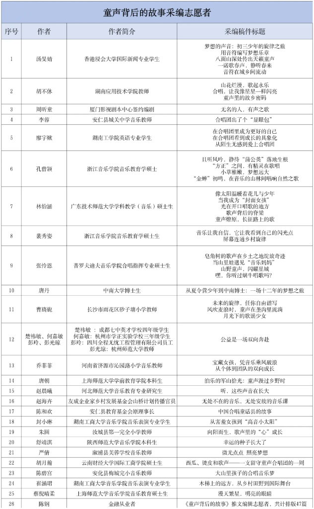 这是《童声背后的故事》第三辑最后一篇文章,全书共计47 篇乡村美育故事里,故事的呈现离不开 29 位志愿者的全情投入:28 人参与撰稿,1 人用心排版,他们带着不同身份的热忱,在休息时间里挤出专属 “公益时区”,把乡村孩子的合唱故事写得鲜活动人。