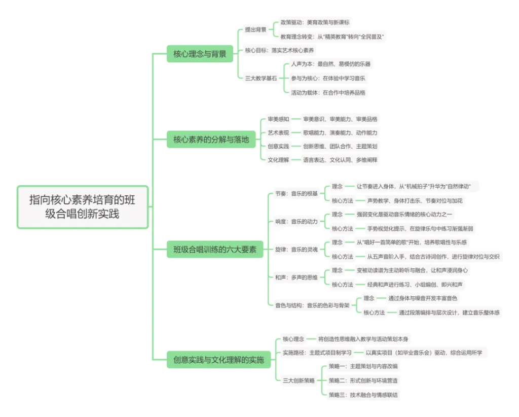 本节课以“核心素养、班级合唱、创新实践”三个关键词为主线,围绕艺术核心素养的四维度拆解与落地、班级合唱训练的六大要素、创意实践及文化理解的教学案例四大知识点展开。