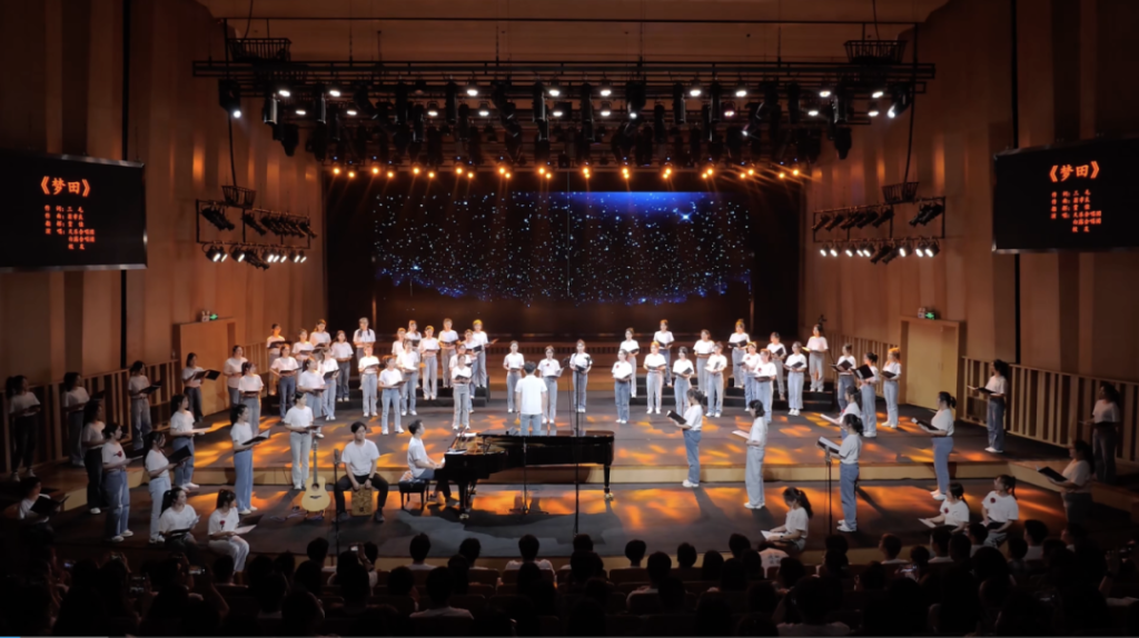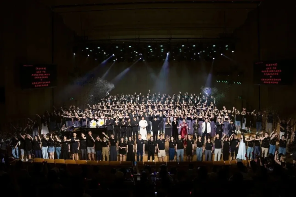 舞台与互动:演员不着演出服,统一白t恤+牛仔裤,全程不下台(唱时站立、不唱时静坐聆听),打破“演员与观众”界限。舞台乐池降下,与观众席无缝连接,大屏幕显示“今天没有演员,所有观众都是歌唱者”,引导全场跟唱。加入“校友讲述”与“公益环节”(特邀德清公益副秘书长李卫英老师参与),强化文化与情感共鸣。