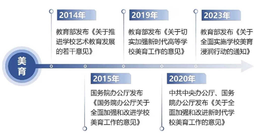 美育政策发展脉络:2014年,教育部发布《关于推进学校艺术教育发展的若干意见》;2015年,国务院办公厅发布《国务院办公厅关于全面加强和改进学校美育工作意见》,基础推进美育工作,覆盖学校层面;2019年,教育部发布《关于切实加强新时代高等学校美育工作意见》,明确高校课堂教学、艺术实践、艺术展演、校园文化四位一体引领作用,聚焦高校美育引领;2020年,中共中央办公厅、国务院办公厅发布《关于全面加强和改进新时代学校美育工作意见》,拓展至中小学与高校,全过程美育培养,拉长美育实施时间线;2023年,《关于全面实施学校美育浸润行动的通知》相关政策,强调全方位、多维度美育,突破课堂与时空限制,覆盖校园全场景。