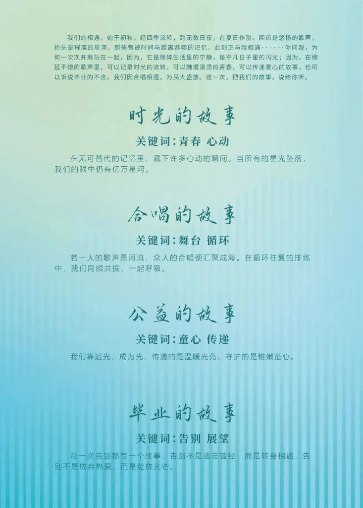 沉浸式设计:主题与篇章:分为①时光的故事(青春、心动)。②合唱的故事(舞台、循环)。③公益的故事(童心、传递)。④毕业的故事(告别、展望)四大篇章;作品设计上串联《歌声与微笑》《让我们荡起双桨》《心动》等耳熟能详的作品。