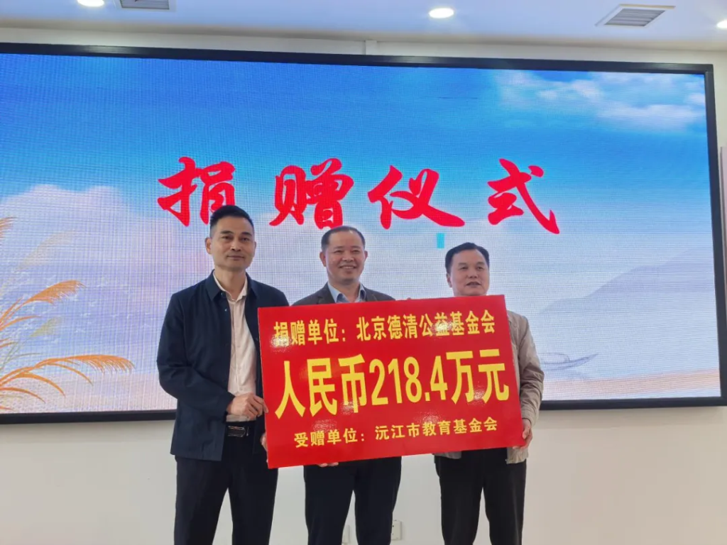 10月17日,北京德清公益基金会受爱心人士吴佳梁先生委托,向沅江市教育基金会捐赠218.4万元仪式在沅江市芙蓉学校举行,德清公益执行秘书长张斌、沅江市教育基金会秘书长刘小年、沅江二中校长卜令波出席仪式,资金将用于支持沅江二中教育事业发展。