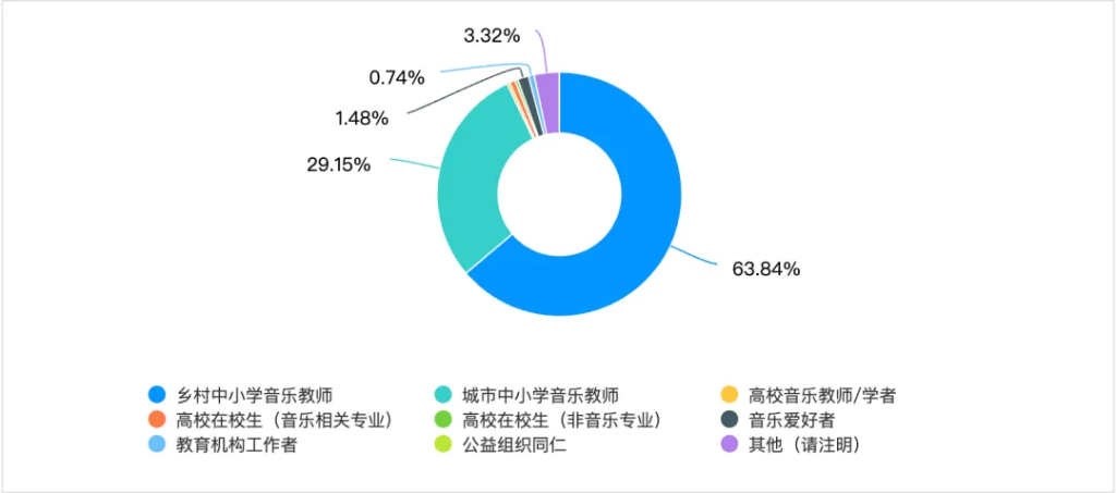 数据显示,填写问卷的老师中,中小学音乐教师合计占比92.99%(其中任教于乡村中小学的音乐教师占63.84%,任教于城市中小学的音乐教师占29.15%),构成了本次调研的绝对核心群体。