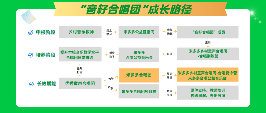 “音籽合唱团”是由北京德清公益基金会于2023年发起的一项战略性乡村美育赋能计划。该项目在“快乐合唱3+1”县域模式和“米多多合唱团”项目校基础上,将支持重心从县域层面精准下沉至乡村一线音乐教师个体。通过“米多多公益直播间”的线上学习与选拔机制,每年从全国范围内遴选出60名真努力的一线乡村音乐教师,将其吸纳为“音籽合唱团”成员。入选教师可免费参加在长沙举办的“米多多乡村童声合唱周”合唱训练营,接受为期8天的系统化专业培训。完成培训后,教师返回所在学校开展合唱教学实践,表现优异者可持续获得专家指导、展演机会等多维度成长支持。