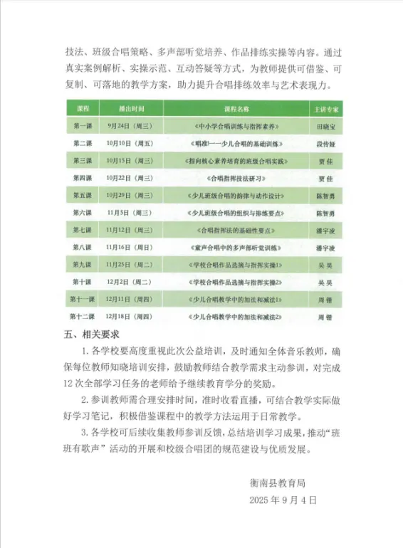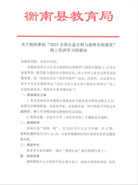 一、 文件引领,明确学习要求。 由县教育局印发《关于组织全县音乐教师参与2025全国公益合唱与指挥名师课堂线上研修的通知》,明确将参与线上学习、完成相应任务纳入教师继续教育学时登记及学校年度艺术教育评价参考。要求各校指定负责人,确保通知到、组织好每一位专兼职音乐教师,从制度上保障全员参与。