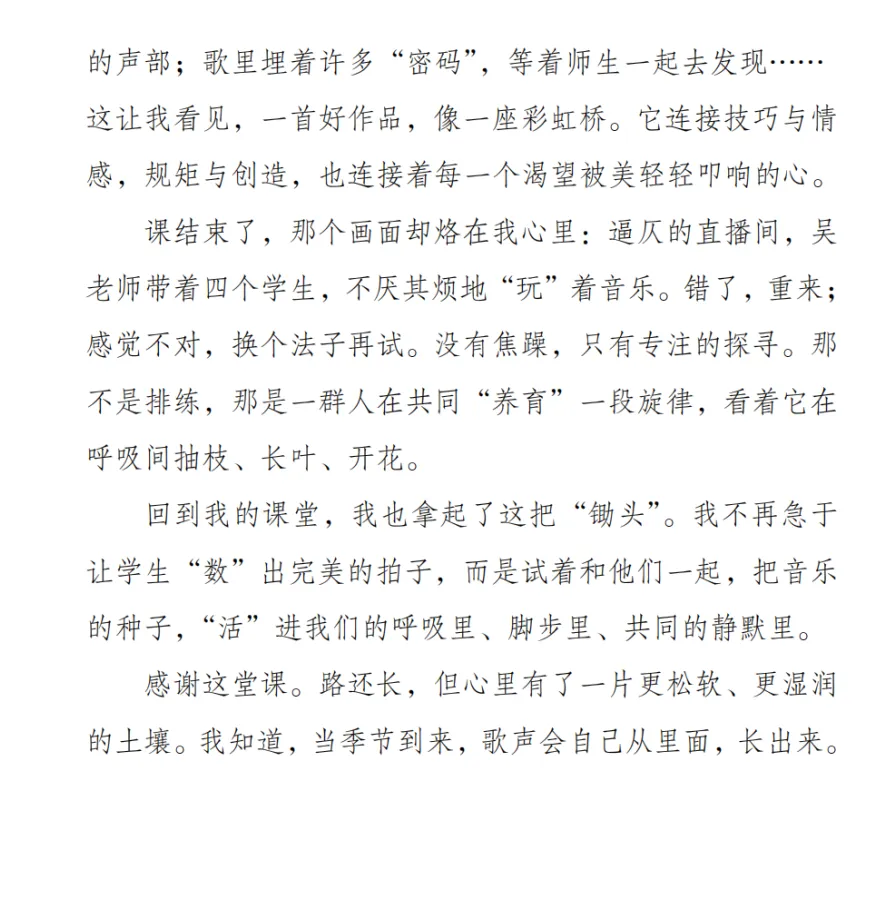 三、 持续赋能,构建长效育人机制。 工作室总结比赛中的成功案例与经验,将其转化为可在日常教学中推广的“艺术心理融合”微策略。例如,将合唱中的呼吸训练与情绪放松技巧结合,将声部配合练习转化为团队信任拓展活动。我们致力于帮助教师成长为既懂艺术教学又具心理觉察力的“双师型”引导者,让“班班有歌声”的效应从赛场延伸至每一节常态课,持久助力学生阳光成长。
