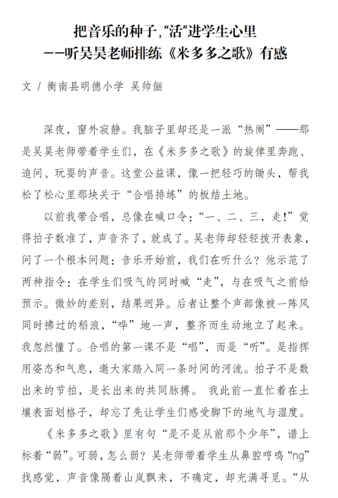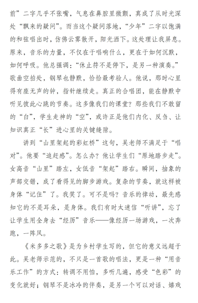 合唱教育是一场以乐为桥、以心传心的旅程,吴老师以《米多多之歌》为钥匙,为我们打开了合唱排练与指挥教学的新思路。愿每一位热爱着合唱指挥艺术的音乐教育者都能从中汲取灵感,带着初心与情怀,在每堂合唱排练课上播撒音乐的种子,让孩子们在旋律与和声中感受美、创造美,让合唱的歌声成为校园里最动人的风景,让音乐教育的光芒始终温暖且坚定地绽放。