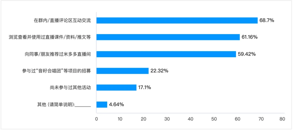 数据显示,用户深度参与形式多元:68.7%参与过群内或直播互动,61.16% 使用过课件资料,59.42%曾向同事朋友推荐直播间。即时交流与实用资源,成为大家最青睐的衍生参与方式。
