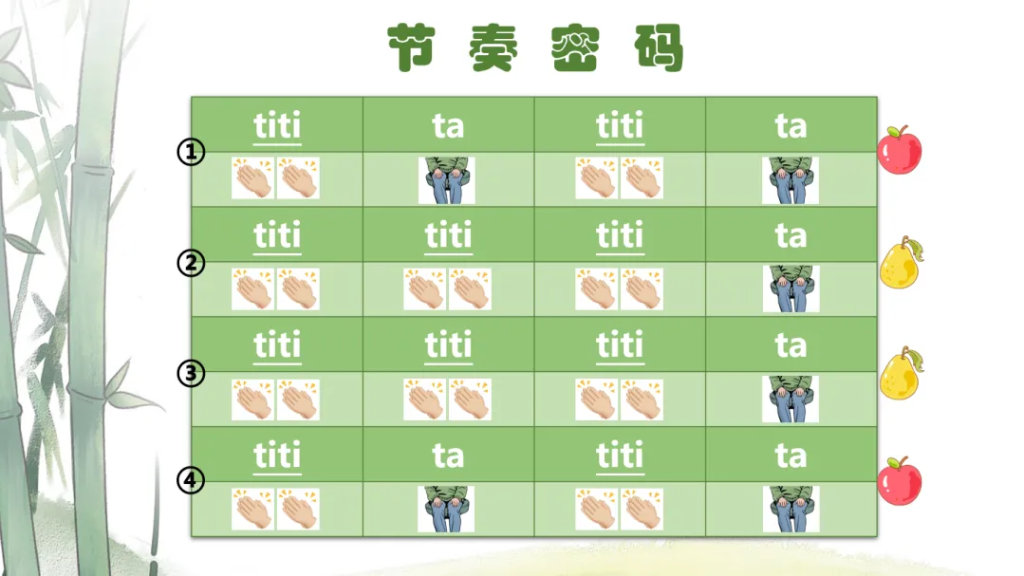 从贯穿歌曲的“titi”“ta”节奏模仿开始,学生通过拍手、拍腿体验哈尼音乐的活泼韵律。引入“苹果句”和“梨子句”,树立相同与不同的乐句概念。在游戏中自然建立恒拍感与节奏型记忆。