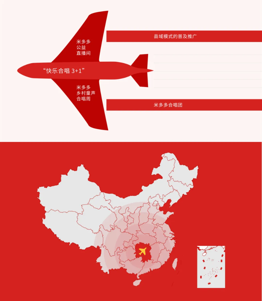 “快乐合唱3+1”以“米多多公益直播间”和“米多多乡村童声合唱周”为“双翼”,形成从线上到线下的多维体验;以县域模式的普及推广与“米多多合唱团”项目校(包括音籽合唱团)的示范带动,点面结合“双轨”齐驱;以“湖南模式”为基础,向周边省份创新输出,形成中国中部合唱公益的区域发展,逐渐达成双向奔赴的合唱公益生态,推动中国乡村合唱公益发展,促进美育发展的燎原之势。