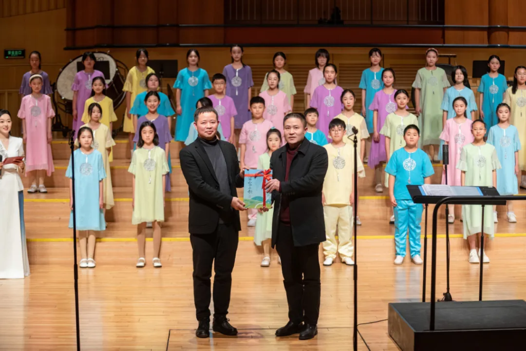 值得一提的是,郑州场音乐会河南BC童声合唱团首唱四首《苗家山歌》,系列曲目由“城步希望小学有知米多多合唱团”公益项目改编。北京德清公益基金会执行秘书长张斌先生与湖南城步县副县长王章志同志还一同登台,完成了合唱曲谱交接仪式。