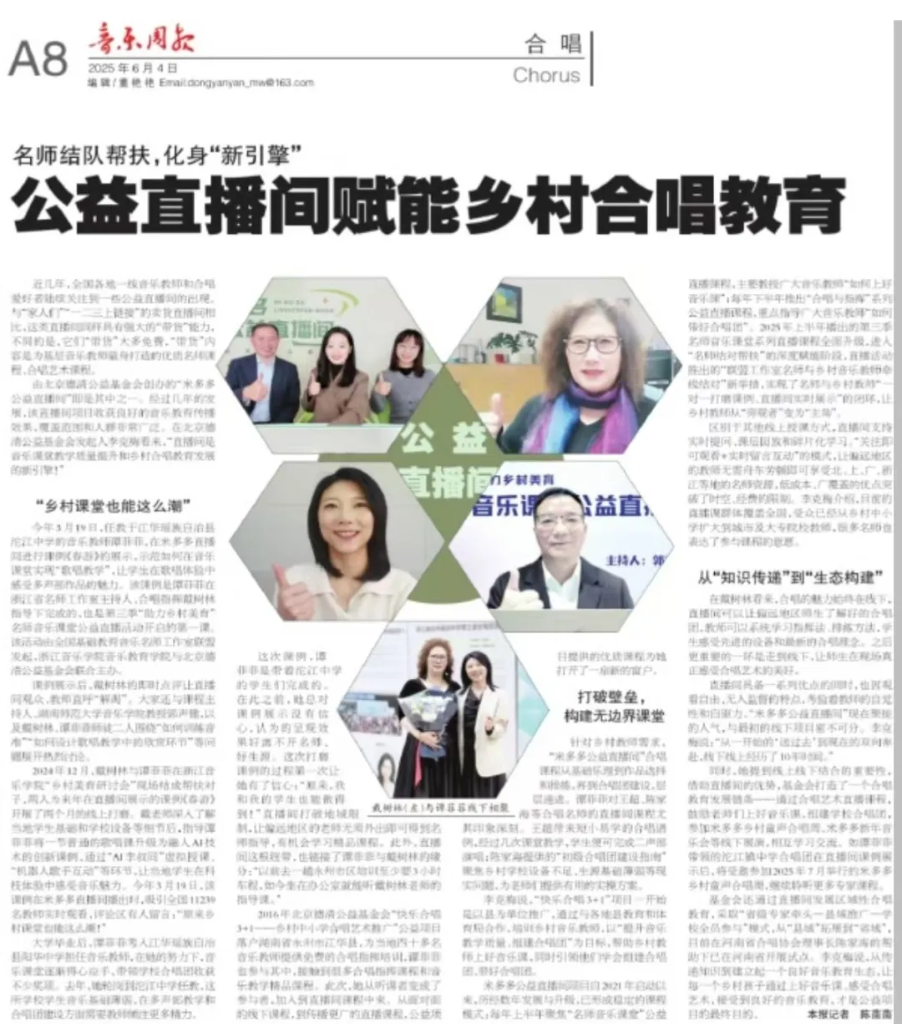 首创“名师结对帮扶”机制:在《第三季“助力乡村美育”名师音乐课堂》中,“快乐合唱3+1”项目县12位乡村教师与全国基础教育音乐名师工作室联盟名师结对,结对名师“一对一课”帮助乡村教师修改、打磨课例,乡村教师作为主讲人亮相直播间。其中,湖南江华县谭菲菲、汝城县何玲娜老师的课例分别获得2025“万叶杯”全国音乐微课初中组一、二等奖。