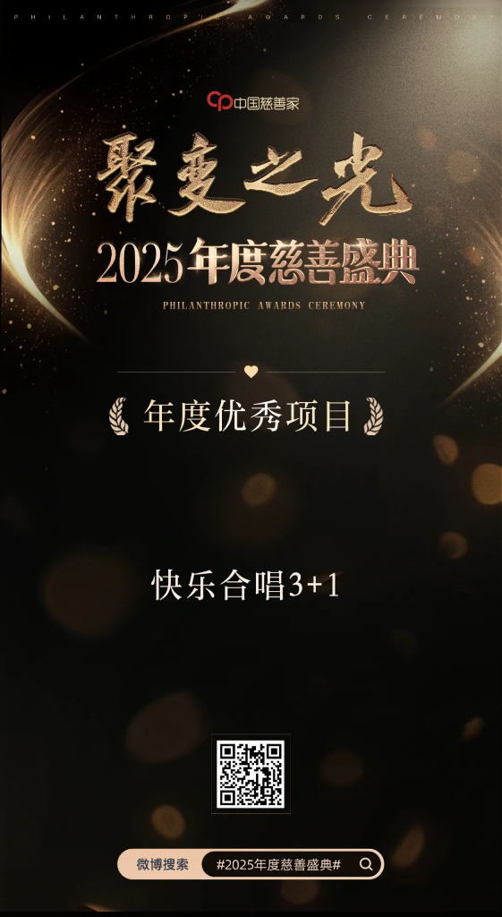 2026年1月8日,由《中国慈善家》主办的“聚变之光”“2025年度慈善盛典”在北京举行,“快乐合唱3+1——乡村中小学合唱艺术推广”公益项目获评“年度优秀项目”。