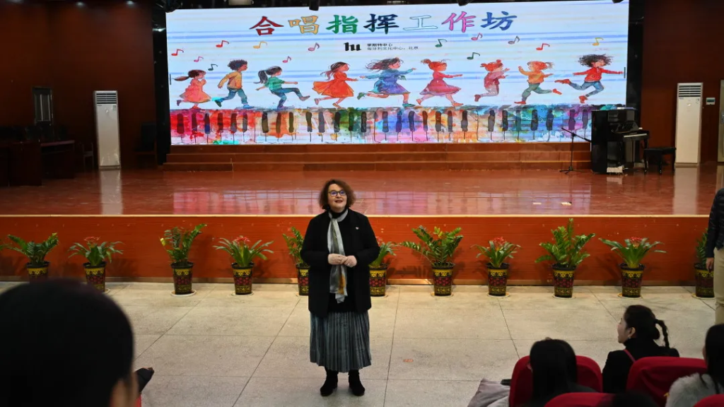 关注教学的应用与拓展。兰迪老师现场示范,一首简单民歌,经节奏变奏、卡农编排、固定音型伴奏等巧思设计,就能蜕变成一堂生动有趣的合唱课。培训中,老师还邀请参训学员上台实操指挥,并针对性点拨指导。最后,全场伴着欢快的匈牙利歌曲齐声欢唱,为本次培训画上圆满句号。