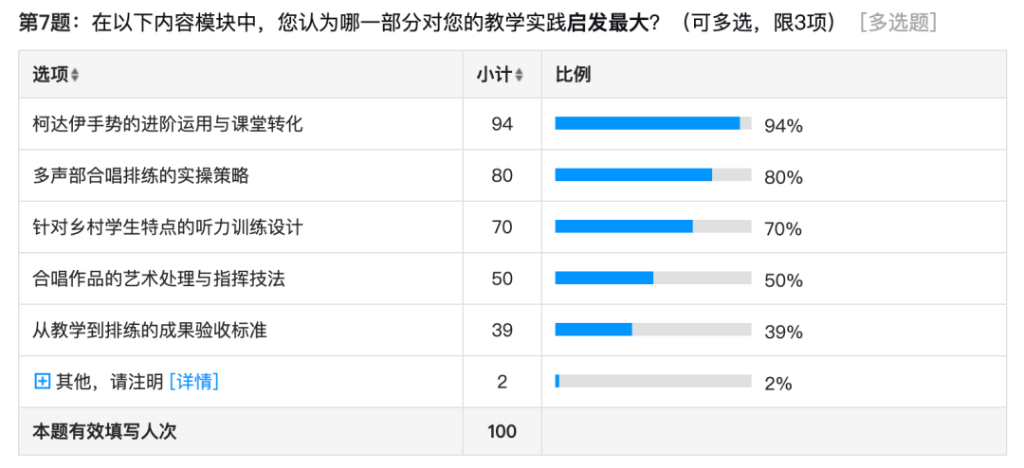 未来需求明确:老师们普遍希望在未来深化“合唱指挥技法”、“科学声音训练”及“本土化教学案例开发”等更具实操性的内容.