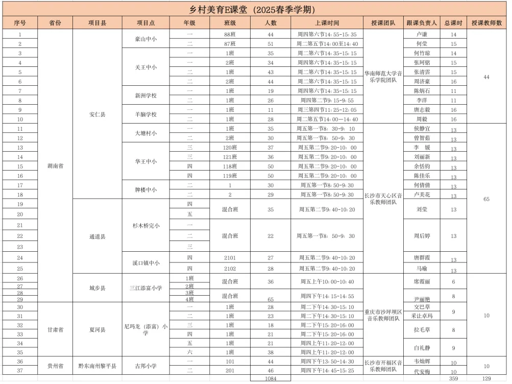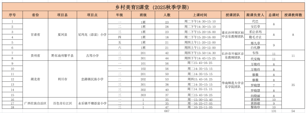 2025年度,项目吸引了长沙市天心区音乐教师团队、长沙市开福区音乐教师团队、重庆市沙坪坝区音乐教师团队、华南师范大学音乐学院师生团队153名师生为5省7县14所学校55个班级1751名小学生开设在线音乐课490节。