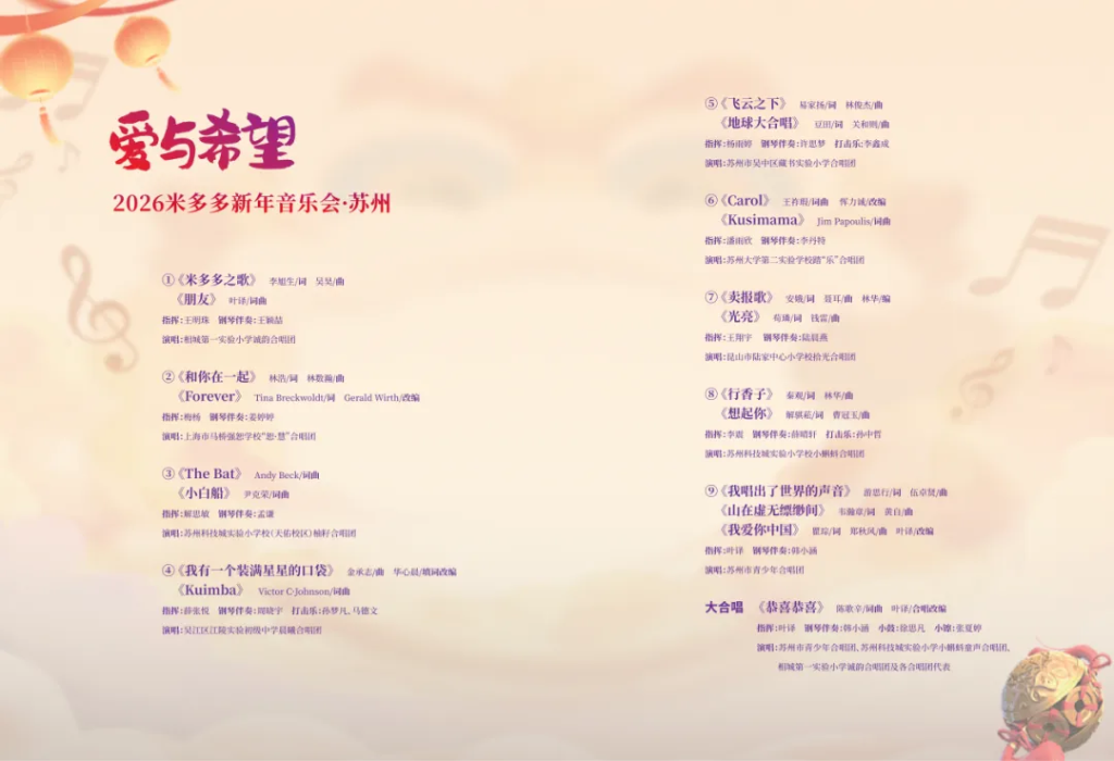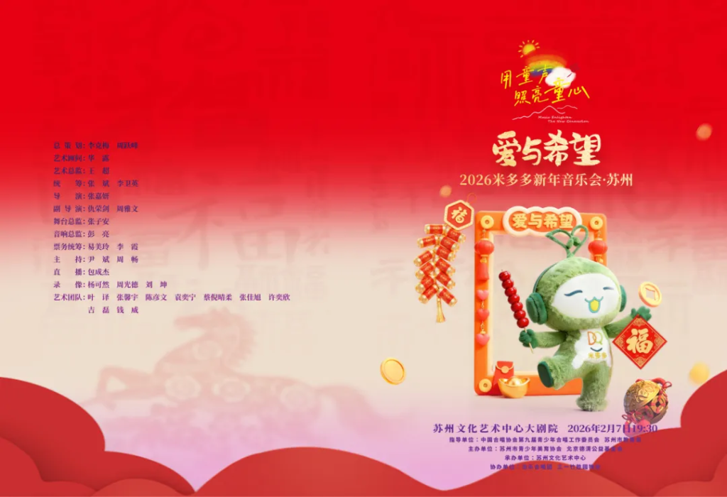 2026米多多新年音乐会·苏州站由中国合唱协会第九届青少年合唱工作委员会、苏州市教育局的指导下,由苏州市青少年美育协会与北京德清公益基金会联合主办,苏州文化艺术中心承办,并得到泊乐合唱团、三一竹胜园物业的协作支持。