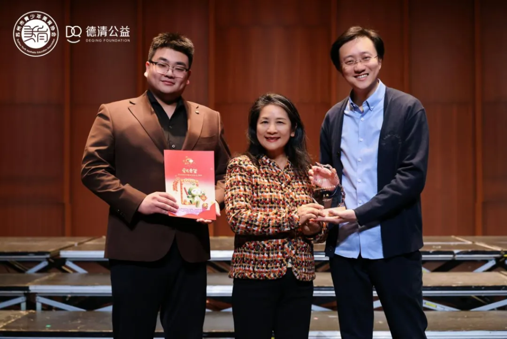 音乐会结束后,德清公益发起人李克梅女士为本次音乐会艺术总监王超先生颁发“2025乡村美育公益大使”证书及奖牌。自2022年起,王超老师率泊乐合唱团成员持续公益助力“快乐合唱3+1”公益项目,深入乡村中小学开展合唱教学指导、资源对接等系列行动,用专业的艺术素养和坚定的公益初心,持续推动乡村中小学合唱教育的普及与发展。