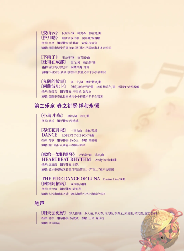 由于演出时间恰值立春时节,易老师便设计音乐会主题为 “春之颂·童声暖人间” ,为了将这一主题化为可感可听的流动诗篇,他精心设计了 “春之苏醒—春之和鸣—春之祈愿” 三大乐章。每个乐章皆以一首关于“春”的耳熟能详的旋律为引,带领观众由浅入深,步入一场沉浸式的春日声景。