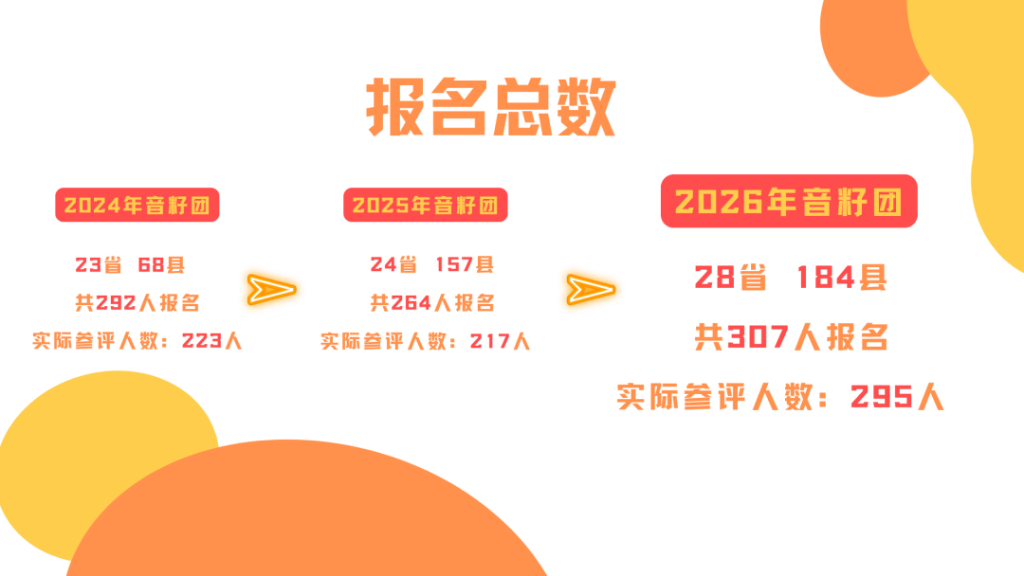 同时,由于河南省济源市、湖北省红安县、湖南省衡阳县、湖南省衡南县已入选2026年“米多多公益直播间项目县”,以上县域的教师将独立成团参加“米多多乡村童声合唱周”之合唱训练营,因此不参与2026“音籽合唱团”团员招募活动的评选。剔除上述4县共12位教师(济源市1人、红安县5人、衡阳县4人、衡南县2人)的报名数据后,最终共有295位教师进入2026“音籽合唱团”的评选环节。