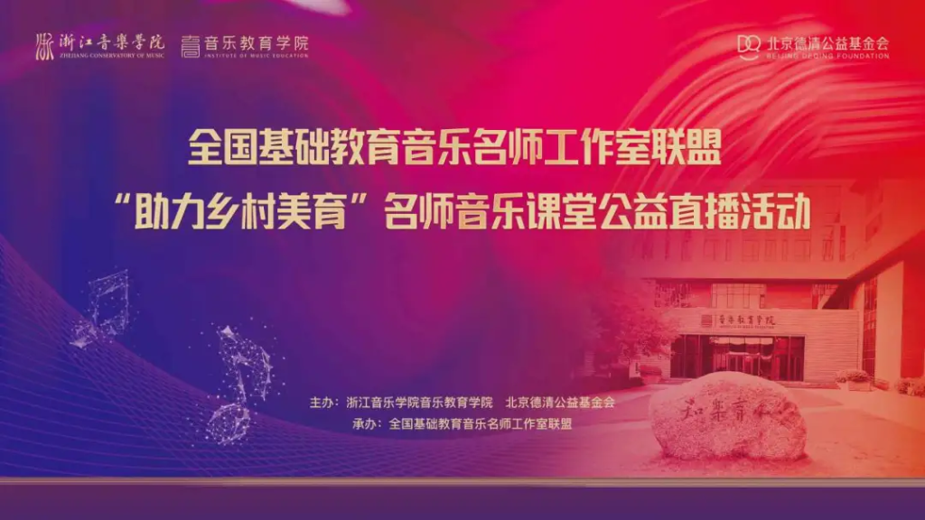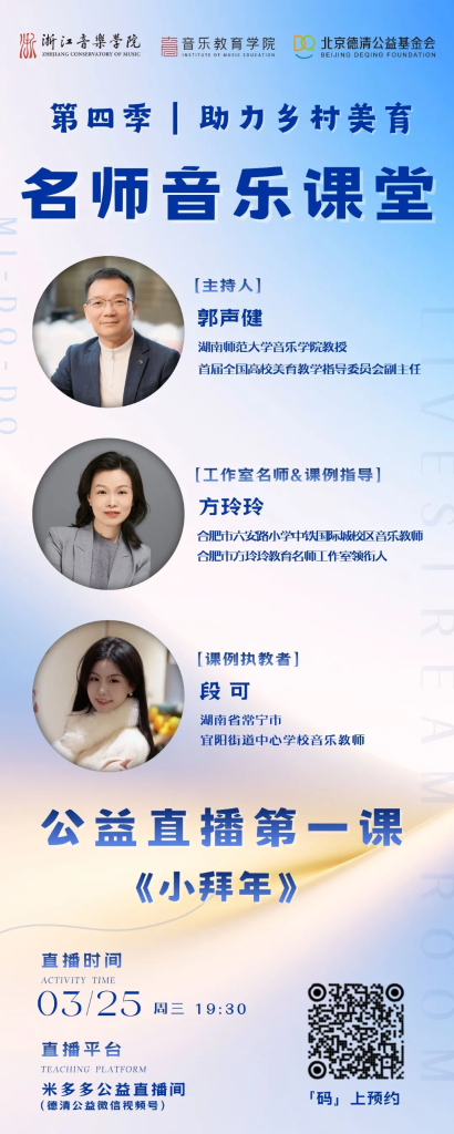 由全国基础教育音乐名师工作室联盟发起,浙江音乐学院音乐教育学院与北京德清公益基金会联合主办、湖南师范大学音乐学院乡村美育中心协办的第四季“助力乡村美育”名师音乐课堂公益直播活动将于3月25日(周三)晚七点半正式启动。