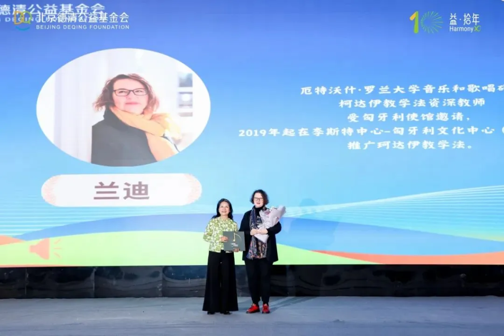 兰迪老师是中匈文化交流中最温暖动人的使者。她携“国宝级”柯达伊教学法跨越山海而来,从2019年湖南汝城柯达伊公益培训开始,到湖南安仁的乡村课堂,再到湖北黄冈、重庆、江西遂川,直至如今的江西于都,一路播撒音乐的种子。她陪伴孩子们唱响“合唱童话”,用音符点亮童心,用音乐陪伴了全国14个省市、5000多名师生的音乐之路。2025年,兰迪老师被评为“快乐合唱3+1”项目“突出贡献者”,这份荣誉也见证了她八年来与中国乡村音乐教育的深情相守。